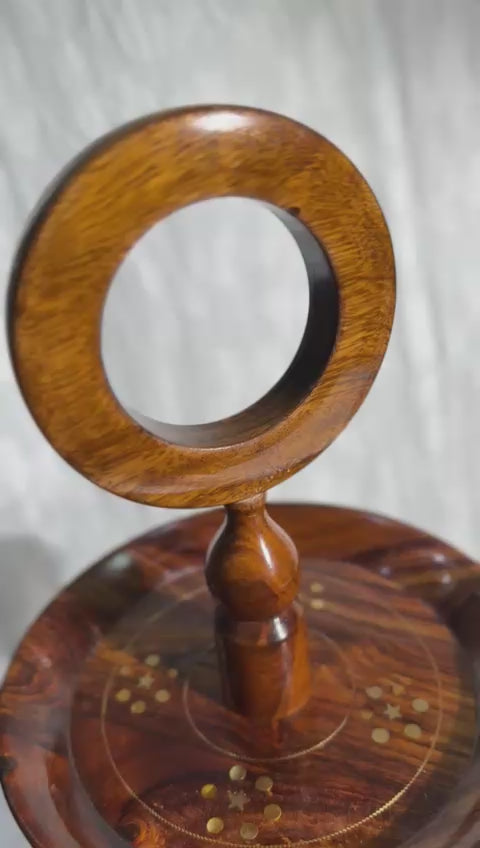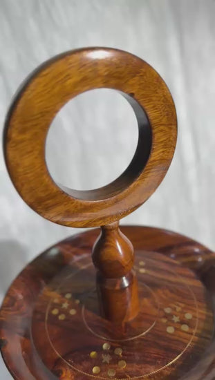 Elevate your presentation with this elegant, handcrafted wooden 3-tier serving stand. Made from rich, polished wood, this stand features three circular tiers of varying sizes, perfect for serving desserts, fruits, snacks, or decorative items. Each tier showcases intricate inlaid dot patterns that add a touch of artistry and sophistication. The smooth, glossy finish highlights the natural wood grain, while the sturdy central spindle and ring handle on top make for easy transport. Ideal for festive gatherings, high teas, or as a stunning centerpiece for any occasion.