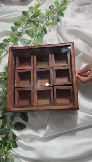 Elevate your home organization or gifting experience with this beautifully handcrafted wooden box. Featuring nine individual square compartments, it's perfect for storing dry fruits, jewellry, spices, or collectibles. The transparent glass lid allows for an elegant display, while the intricate floral carving on the side panel adds a touch of traditional charm. Secured with a sturdy golden latch, this box combines functionality with aesthetic appeal. Ideal for festive gifting, home décor, or personal use. Made from high-quality wood with a smooth, polished finish.