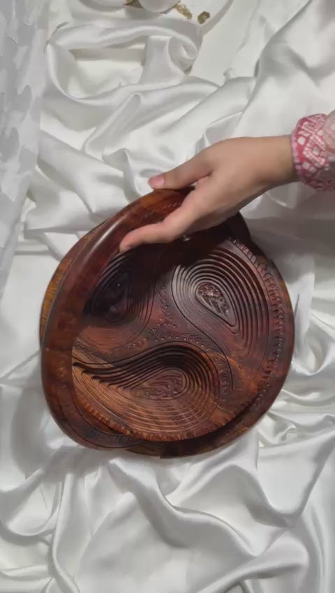 This elegant handcrafted wooden fruit basket is a perfect blend of beauty and functionality. Featuring a foldable design, it easily transforms from a flat decorative piece into a spacious, multi-compartment basket. The delicately carved handle and base highlight traditional craftsmanship, making it ideal for serving fruits, snacks, or as a centerpiece for your dining or coffee table. Made from high-quality wood with a rich, polished finish, this piece is both durable and stylish—perfect for everyday use or festive occasions.